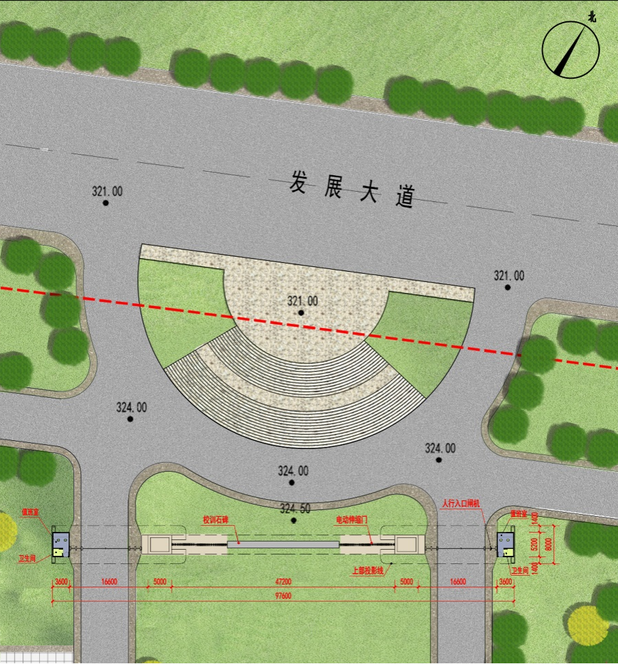 本校区的教学区域为中轴对称的布局方式,大门正是此轴线的起始端点,校门占地面积约700㎡,建筑面积约200㎡;因考虑到造价经济性以及实用性,校门设计总宽度约为97米,高度约15米,其中拱门跨度72米,厚度约为4米,校门尺度设计符合黄金比例,能够带来极致美感和视觉享受;另外大体积的体块使得整个大门构图宏大,气度不凡,具有强烈的视觉冲击力。校外临发展大道,内临校区主干道,满足了校区教学部分的内外交通的需求,在空间处理上,校门离发展大道约35米,校门与发展大道之间围合成一个扇形的大广场,为人流和车流提供足够的集散空间,进入校园后,设置了一个长175米,宽115米,面积约2万㎡休闲活动广场,以植物景观为特色,集休憩娱乐、晨读区各功能为一体。整个广场的绿化呈现出以绿为主的整体风貌,乔灌草自然结合。绿化植物以常绿树种为主,使广场达到四季常绿,三季有花的自然景观。大门实现人车分流,进出分开,穿过校门的道路设计为12米宽,道路两侧各设置2.5米宽的人行道,车行道设计为双车道7米宽,为方便管理,校门两侧留有门卫值班室。