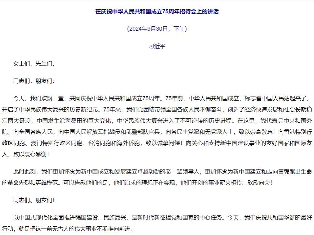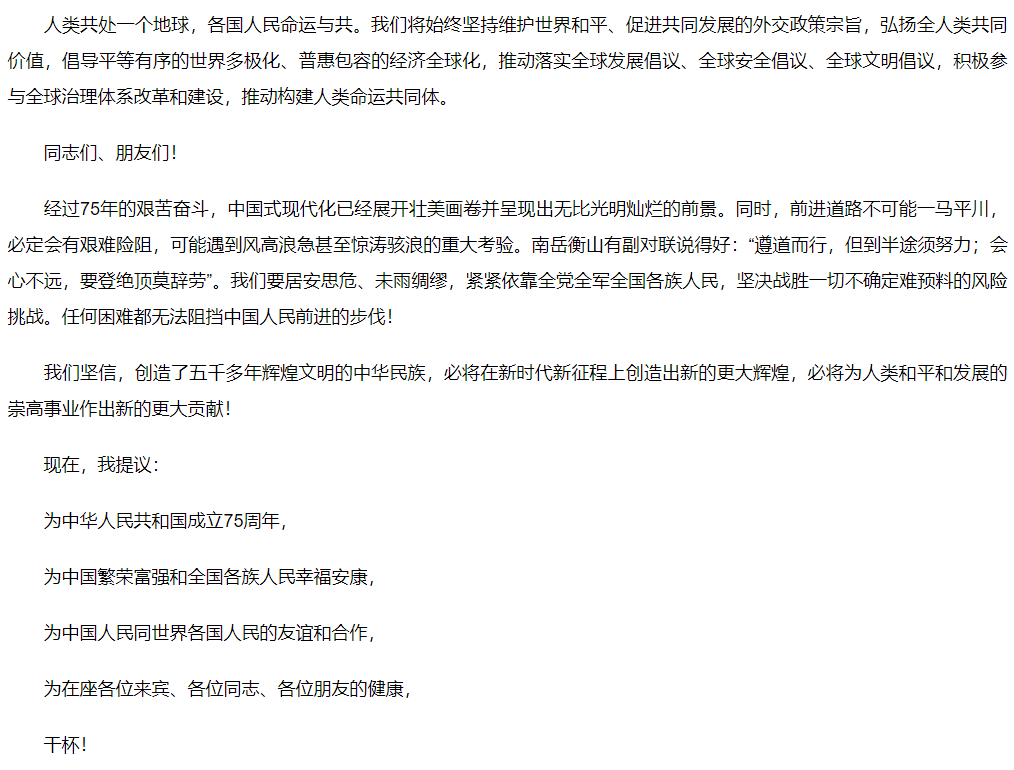 【学习进行时】习近平:在庆祝中华人民共和国成立75周年招待会上的讲话