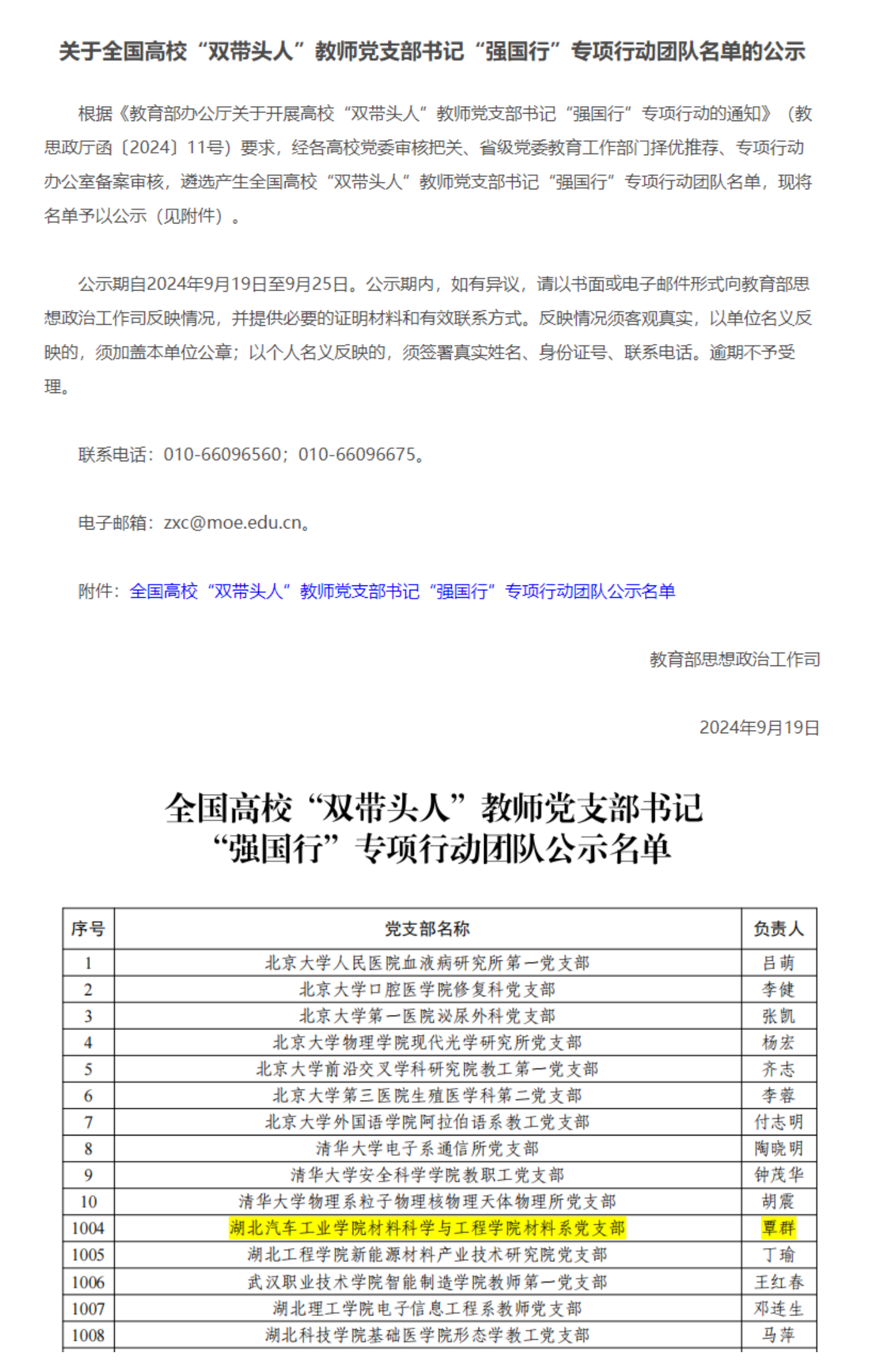 本网讯(文 王雪雪/图 覃群)日前,教育部办公厅公布《关于全国高校“双带头人”教师党支部书记“强国行”专项行动团队名单的公示》,我校材料科学与工程学院材料系党支部成功入选。