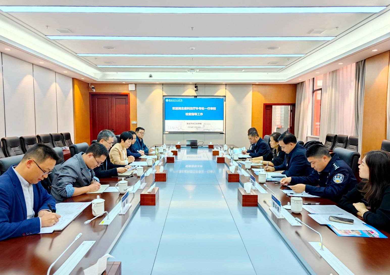 本网讯(文/图 张婷婷)10月29日下午,省科技厅外专处三级调研员秦明、十堰市科技局副局长高清平、十堰市公安局出入境管理支队队长柯正洪一行来校检查指导引智工作,副校长张红霞热情接待。