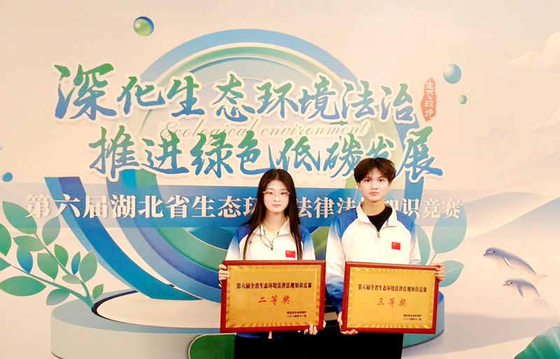 本网讯(文/图 陈来宏)11月15日,由湖北省生态环境厅举办的湖北省第六届生态环境法律知识竞赛在武汉举行,我校人文学院法学专业学生贺中华、郝尹代表学校与十堰市生态环境局、十堰市生态环境保护综合执法支队组队参赛,在比赛中分别获得二等奖、三等奖。