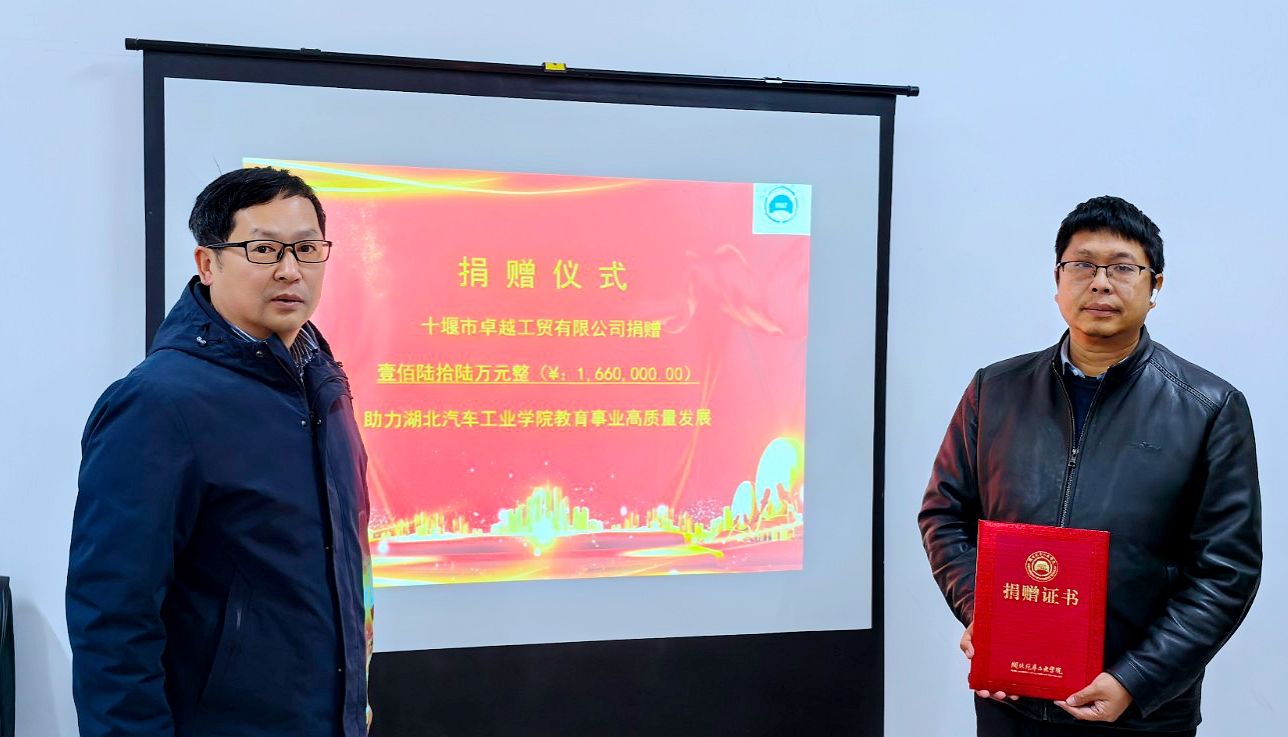 本网讯(文/图 季翔)12月3日,十堰市卓越工贸有限公司捐赠166万元助力我校教育事业发展,捐赠仪式在校园建设与管理处会议室举行。校园建设与管理处处长勾建新、十堰市卓越工贸有限公司总经理沈辉参加捐赠仪式。