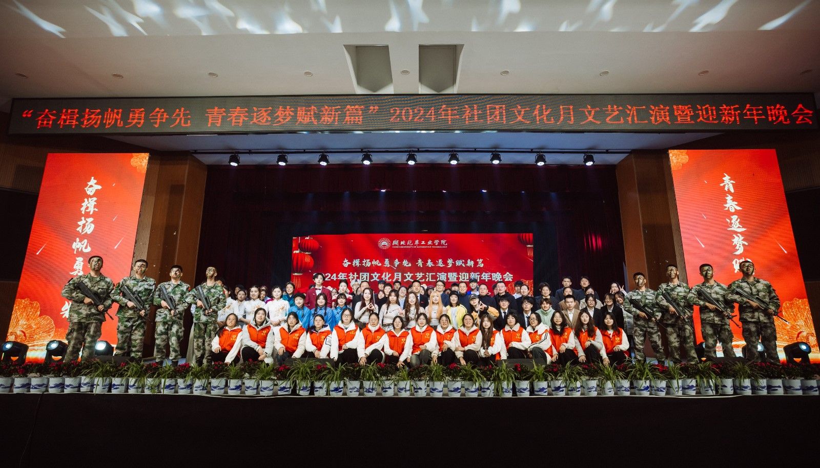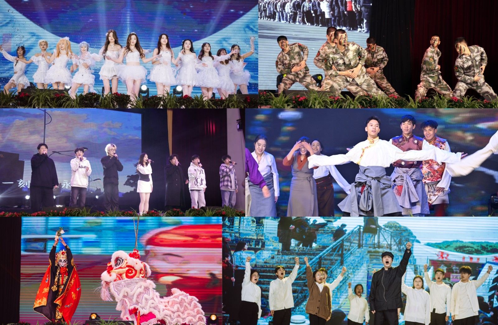晚会在乐时光吉他社激情澎湃的演唱歌曲《镜子中》中拉开序幕。大学生艺术团星空街舞队《激舞青春》、回旋街舞社《邦邦邦》和校志愿者联合会、爱心助残协会《心之语》分别以舞蹈和手语操的形式,以动感的节奏和炫酷的舞姿,诠释了青春的活力与无声的力量。军事协会以英姿飒爽诠释武术表演《军魂筑梦 戎装华彩》,彰显了中华民族坚韧不拔的精神。舞狮队《祥狮幻面》、民族锅庄舞协会和游泳协会的民族舞《黑颈鹤之舞》,通过灵动的祥狮表演、神秘的变脸技艺和优美的舞姿,展示了中华民族文化的博大精深。图书馆读者协会的情景歌舞演绎《白日梦想家》、大学生艺术团合唱队的《歌曲串烧》深情诉说了梦想的力量,歌声中承载着热忱和梦想,激励着大家勇敢追逐梦想。大学生艺术团话剧社和主持队分别带来的话剧《我的1919》、情景朗诵《如愿》,带领观众穿越时空回顾历史,坚定信念砥砺前行。