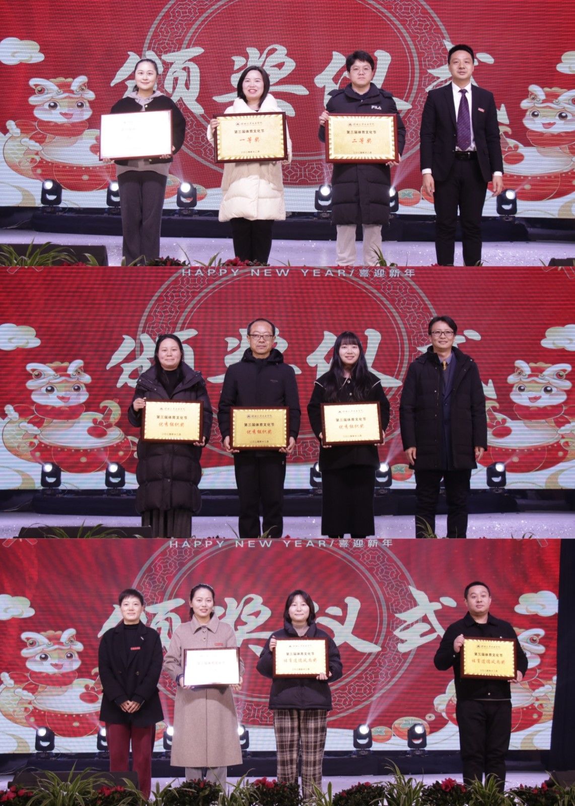 晚会现场还为第三届体育文化节涌现的优秀单位和个人颁奖。艺术与设计学院、马克思主义学院、材料科学与工程学院等获得体育道德风尚奖;电气与信息工程学院、经济管理学院、外国语学院等荣获优秀组织奖;汽车工程学院、机械工程学院、数理与光电工程学院分获体育文化节团体总分第三、二、一名。