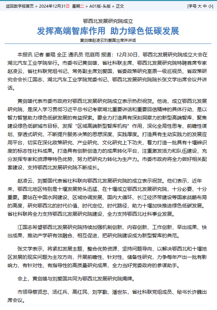 【十堰日报】鄂西北发展研究院成立:发挥高端智库作用 助力绿色低碳发展
