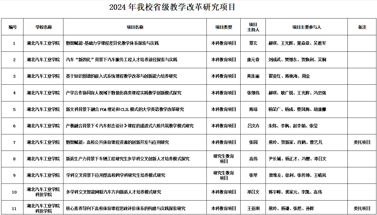 本网讯(文/姜清苹)近日,湖北省教育厅发布《关于公布2024年湖北本科高校省级教学改革研究项目的通知》(鄂教高函〔2025〕1号),我校共11个项目获批立项,其中本科教育项目9个、研究生教育项目2个。