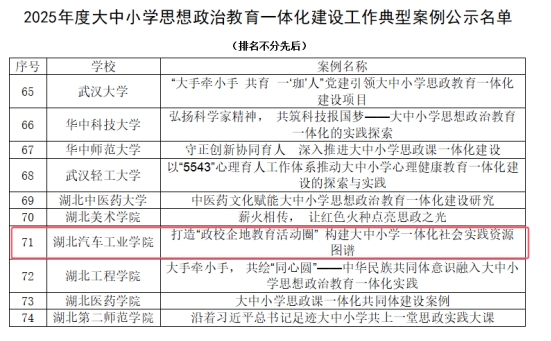 教育部高校思想政治工作质量提升综合改革与精品建设项目组织申报由宣传部牵头,学工部及各二级学院负责实施。此次入选案例由设计学院、学工部、双创学院等单位共同参与,以学校“行走的大思政课”实践育人体系为基础,通过深入挖掘政府、大中小学、企业、社区、乡村等丰富育人资源,构建政、校、企、地四方联动机制,打造了“政校企地教育活动圈”,形成了具有汽院特色的思政育人共同体。通过统筹梳理实践育人资源清单,有机衔接各类实践教育资源,推动大中小学及社会资源开放共享,持续丰富思想政治教育载体途径,完善资源共享、多元共治的长效机制,构建“大中小学社会实践资源图谱”。