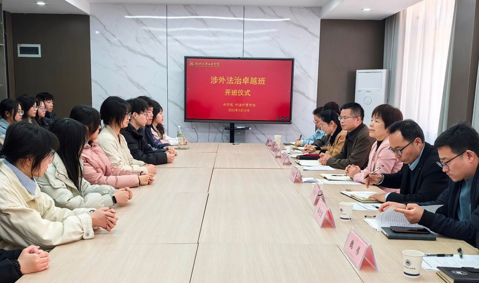 本网讯(文/成继平)3月18日下午,我校“涉外法治卓越班”开班仪式在3206会议室举行。副校长张红霞、法学院院长黄永昌、外语外贸学院院长杨荣广、教务处副处长李行国出席仪式并致辞。法学院、外语外贸学院相关领导、教师代表及首届涉外法治卓越班全体新生参加了开班仪式。
