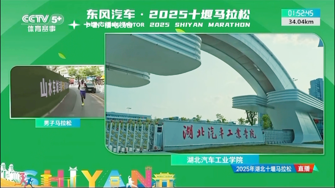 2025十堰马拉松鸣枪开跑。中央电视台体育频道在直播中用时100多秒多角度展示了学校的办学实力与特色以及校园美景。