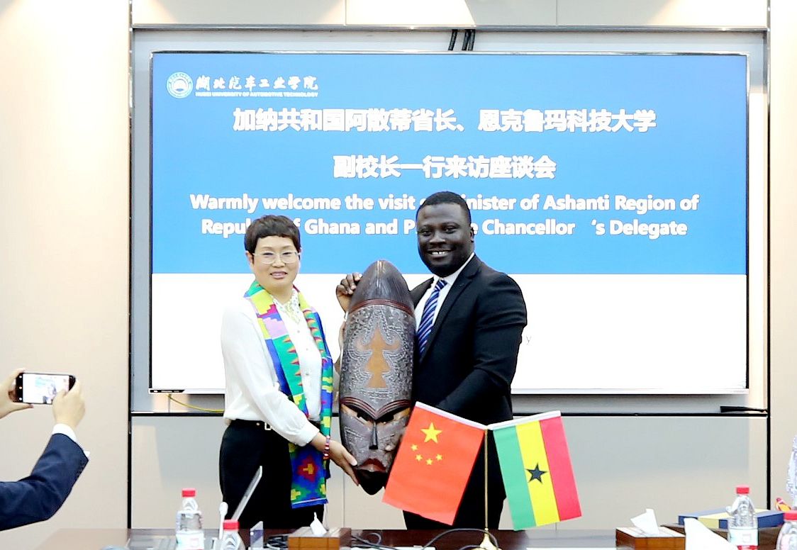 本网讯(文 罗诗棋/图 李一凡、罗诗棋)4月27至29日,由加纳共和国阿散蒂省省长Frank Amoakohene、恩克鲁玛科技大学副校长David Asamoah等15人组成的“汉语桥”加纳教育工作者访华团和由加纳中国企业家联合会等5人组成的加纳企业团来校访问交流。十堰市副市长朱云慧,我校党委书记张文学、校长王晓、副校长张红霞热情接待了来访团。