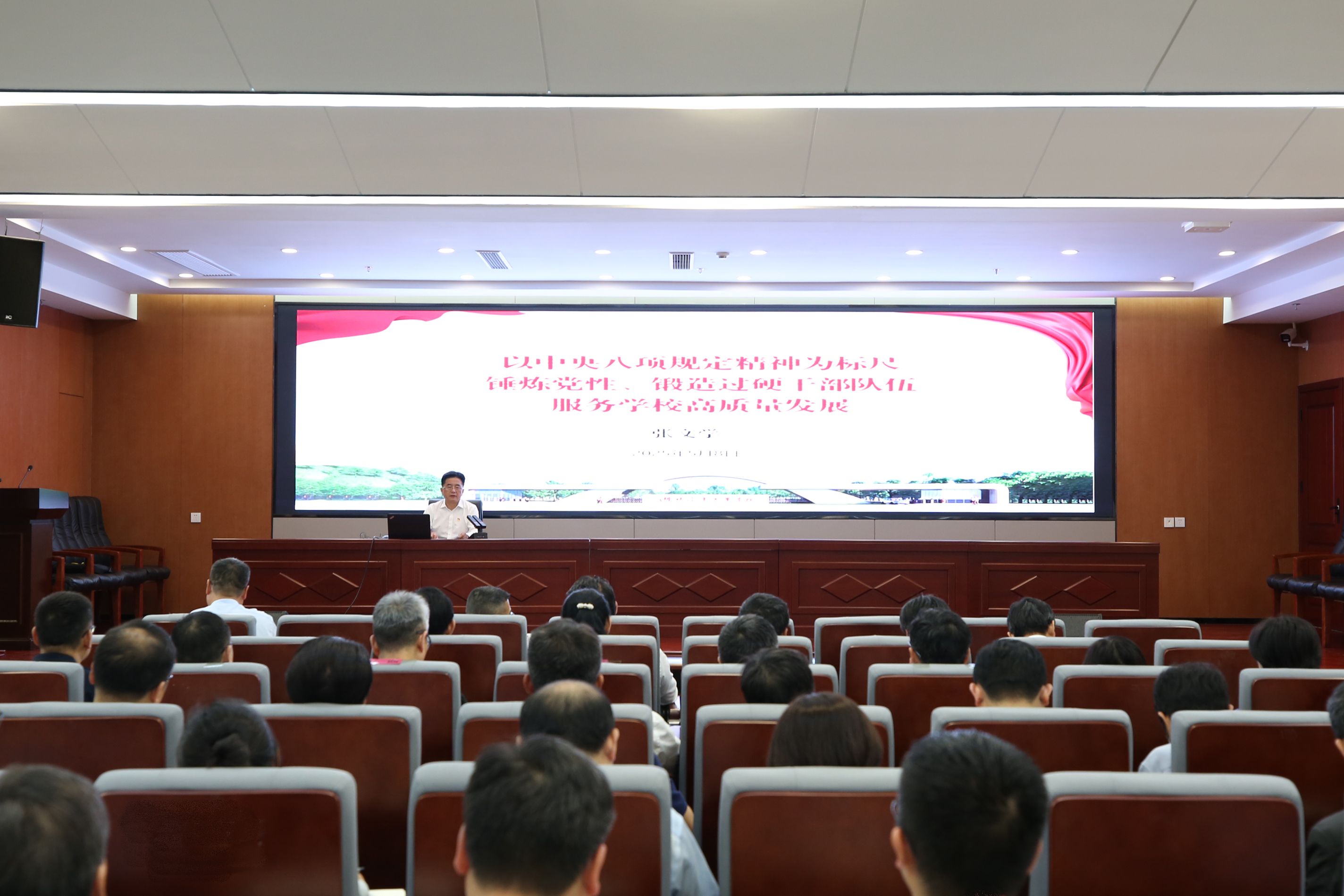 张文学以“以中央八项规定精神为标尺,锤炼党性修养、锻造过硬干部队伍,服务学校高质量发展”为题,围绕“深学笃行,从习近平总书记关于党的作风建设重要论述中汲取力量”“警钟长鸣,深刻认识违反中央八项规定精神的严重危害”“真抓实干,以中央八项规定为标尺锻造过硬作风服务学校高质量发展”三个方面,对中央八项规定精神进行了深入解读。