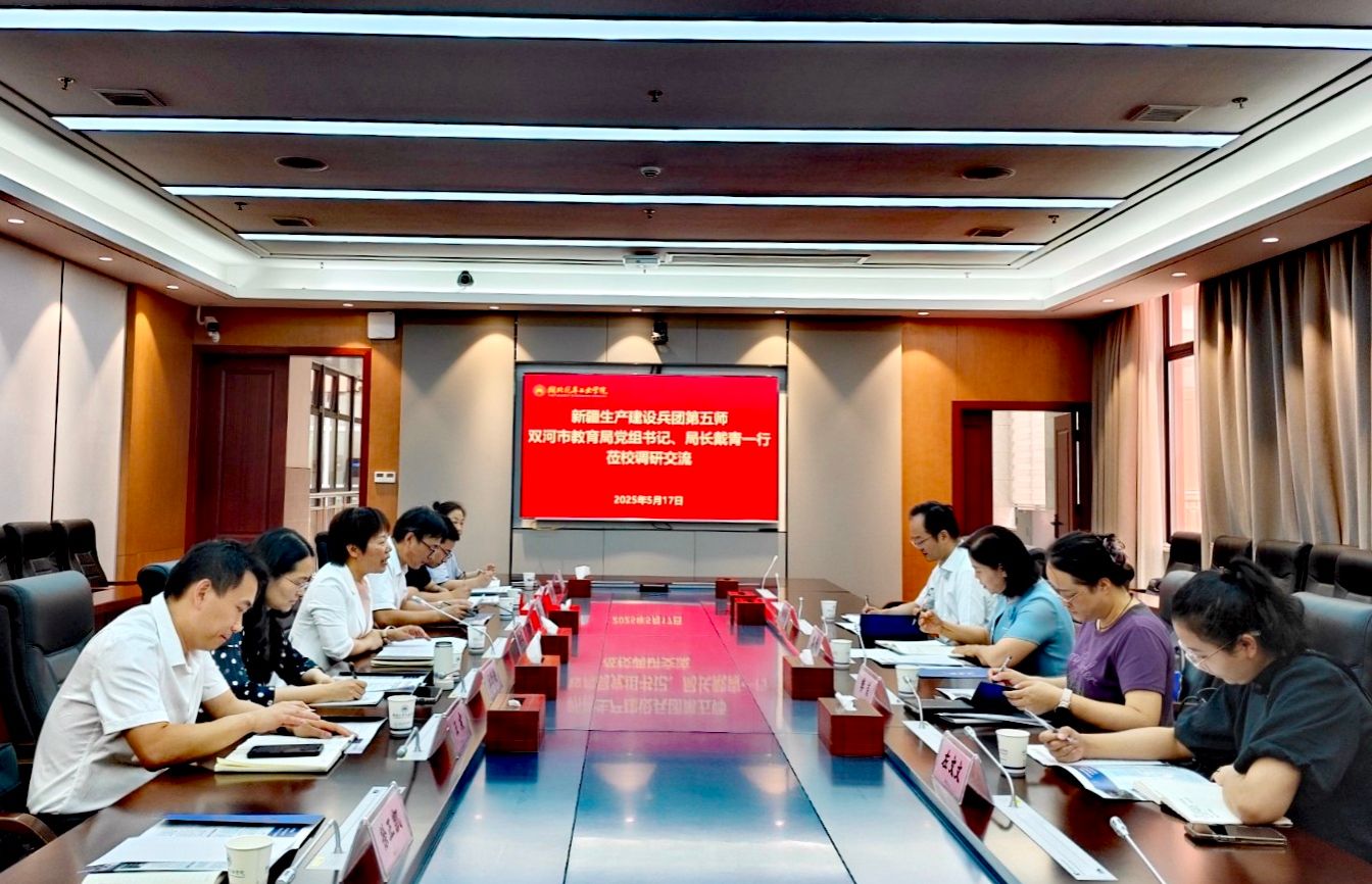 本网讯(文/图 徐正凯)5月17日下午,新疆生产建设兵团第五师双河市教育局党组书记、局长戴青率团来校调研交流,党委常委、副校长张红霞热情接待。
