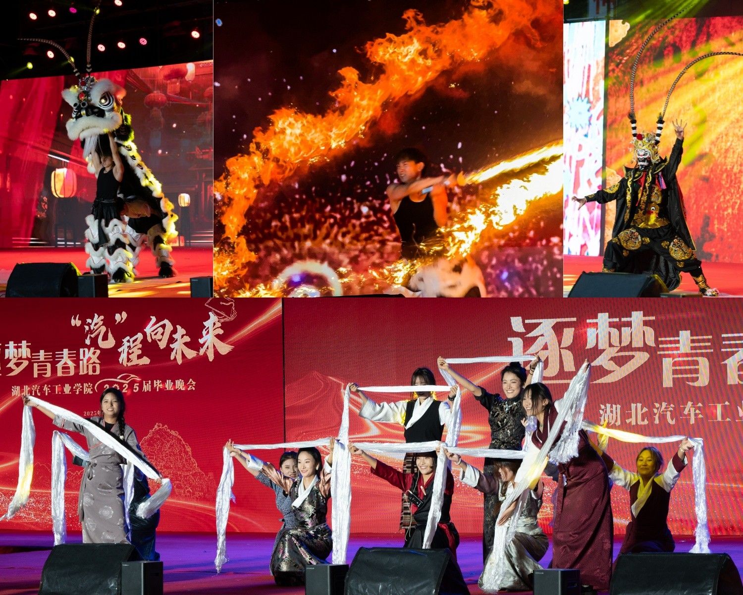 晚会以“青春作笔绘山海”“长歌当帆济沧海”“壮志为翼展鹏程”三大篇章串联,融合社火、舞蹈、歌曲、朗诵等艺术形态,在光影交错间铺展汽院青年的成长画卷。大学生艺术团以开场舞蹈《山海》《乘风破浪》震撼登场,刚劲舞姿诠释学子“不惧风雨、破浪前行”的拼搏底色;歌伴舞《像你这样的朋友》《麦芒》用动感旋律唤醒同窗记忆,活力舞姿让全场毕业生重温朝夕相伴的青春时光;民族锅庄舞《故乡》、啦啦操《你好青春》等四支风格各异的舞蹈作品轮番上演,更有地域民俗社火《炭火流光》点燃舞台,让传统文化在校园焕发新生;压轴歌曲《启程+一路生花+若是月亮还没来》《逆光》以清澈声线凝聚追梦力量,唱响毕业生“执炬前行”的坚定信念。